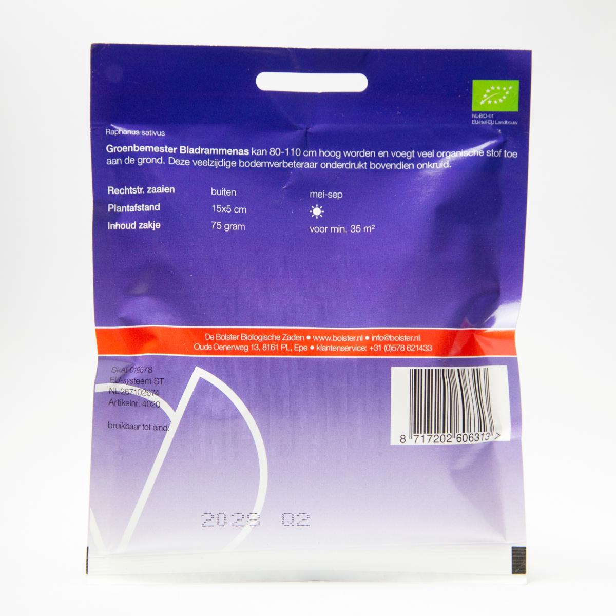 Groenbemester Bladrammenas ontwikkeld zich na het zaaien snel, waardoor onkruid onderdrukt wordt. Deze diepwortelende groenbemester voegt organische stof toe. Eén zakje is voor circa 35 m2 en de plantafstand bedraagt 15x5 cm.