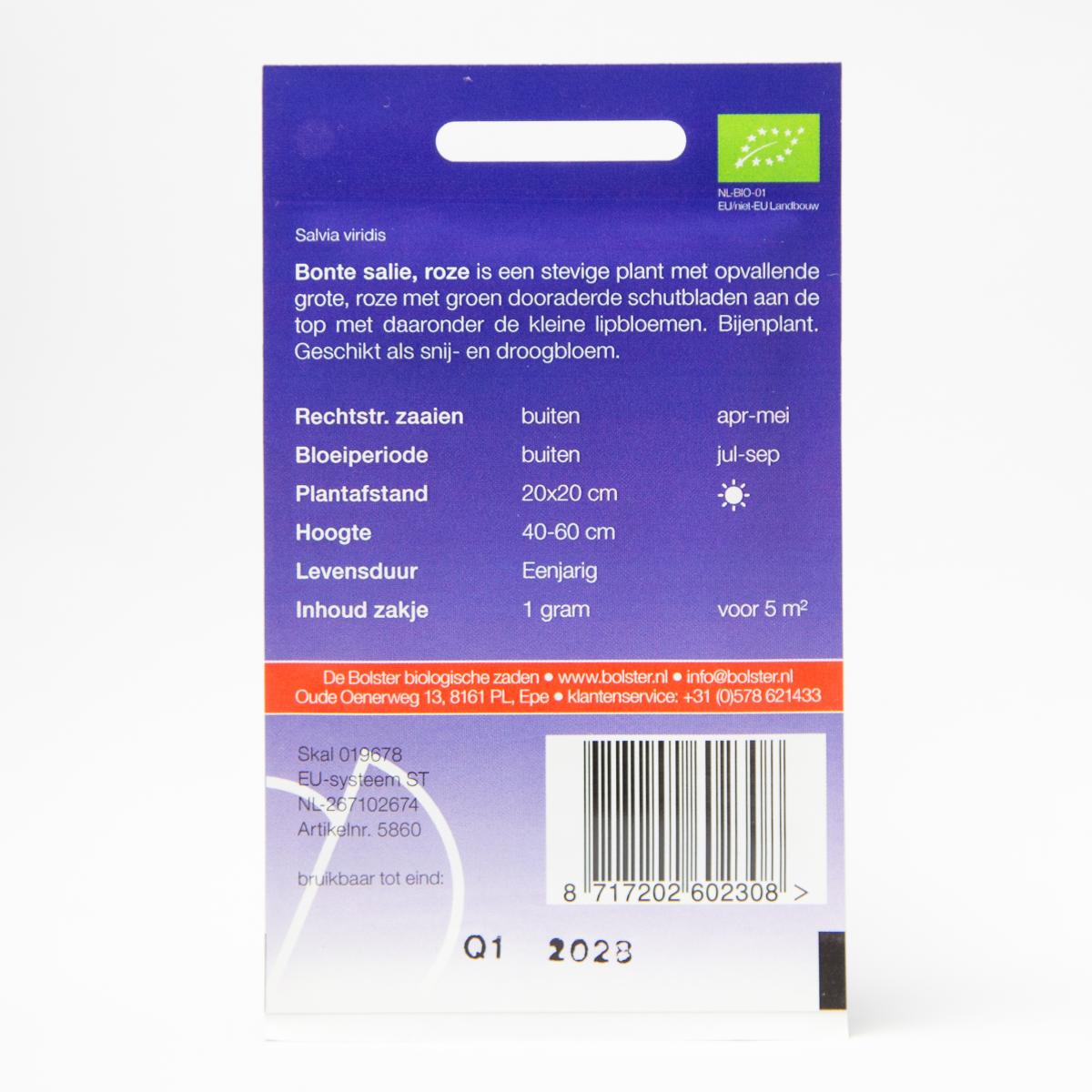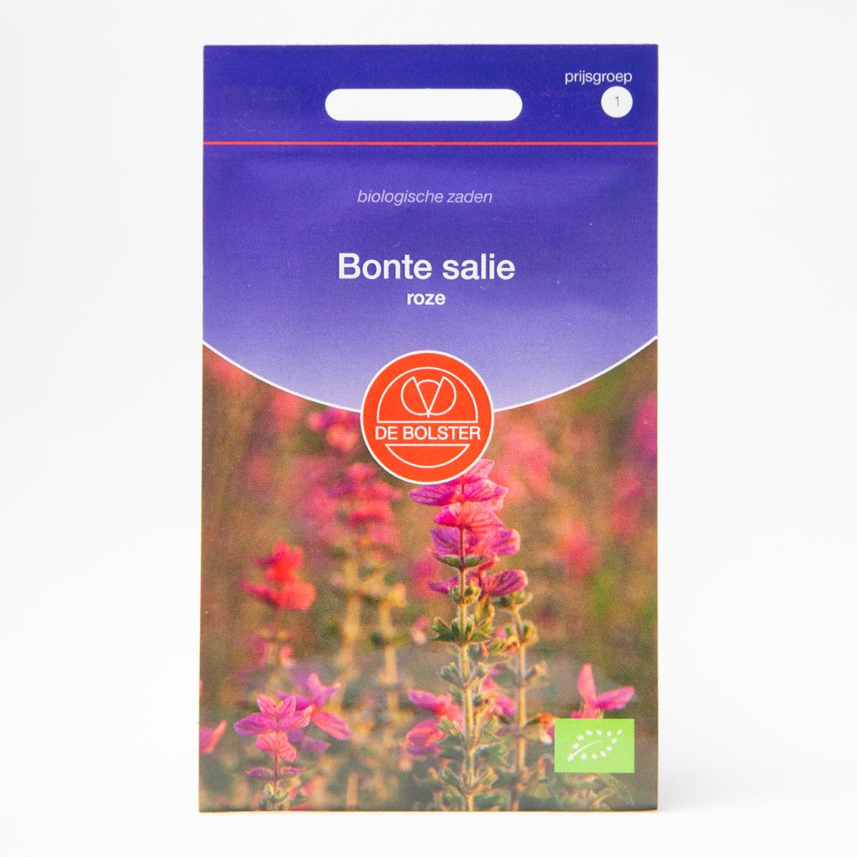 De snij- en droogbloem bonte salie, roze, is een bijenplant met groen dooraderde, roze schutbladen aan de top. Onder de bladen vormen zich de kleine lipbloemen. Eén zakje is voor circa 5m2, en de plantafstand bedraagt 20x20 cm.