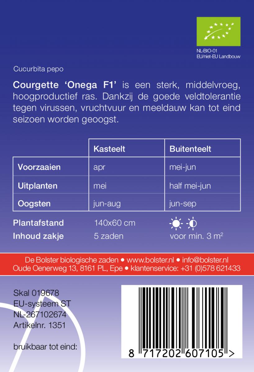Courgette 'Onega F1' is een middelvroeg, hoogproductief ras met een geleidelijke productie van mooi cilindrische, middelgroene, licht gespikkelde vruchten. De robuuste plant is compact maar toch open, waardoor de courgettes eenvoudig te oogsten zijn. Dit sterke ras heeft een goede veldtolerantie tegen virussen, vruchtvuur en meeldauw en is daarom zeer geschikt voor een doorlopende oogst tot aan het eind van het seizoen.