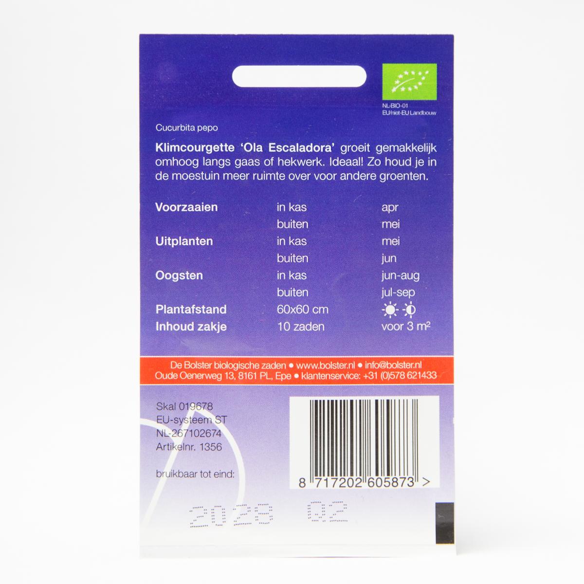 Klimcourgette 'Ola Escaladora' produceert de hele zomer lang donkergroene vruchten die lekker smaken. Geschikt als hekwerk of langs de muren van een stadstuin. De plant houdt van zon. Eén zakje is voor circa 3m2, en de plantafstand bedraagt 60x60 cm.