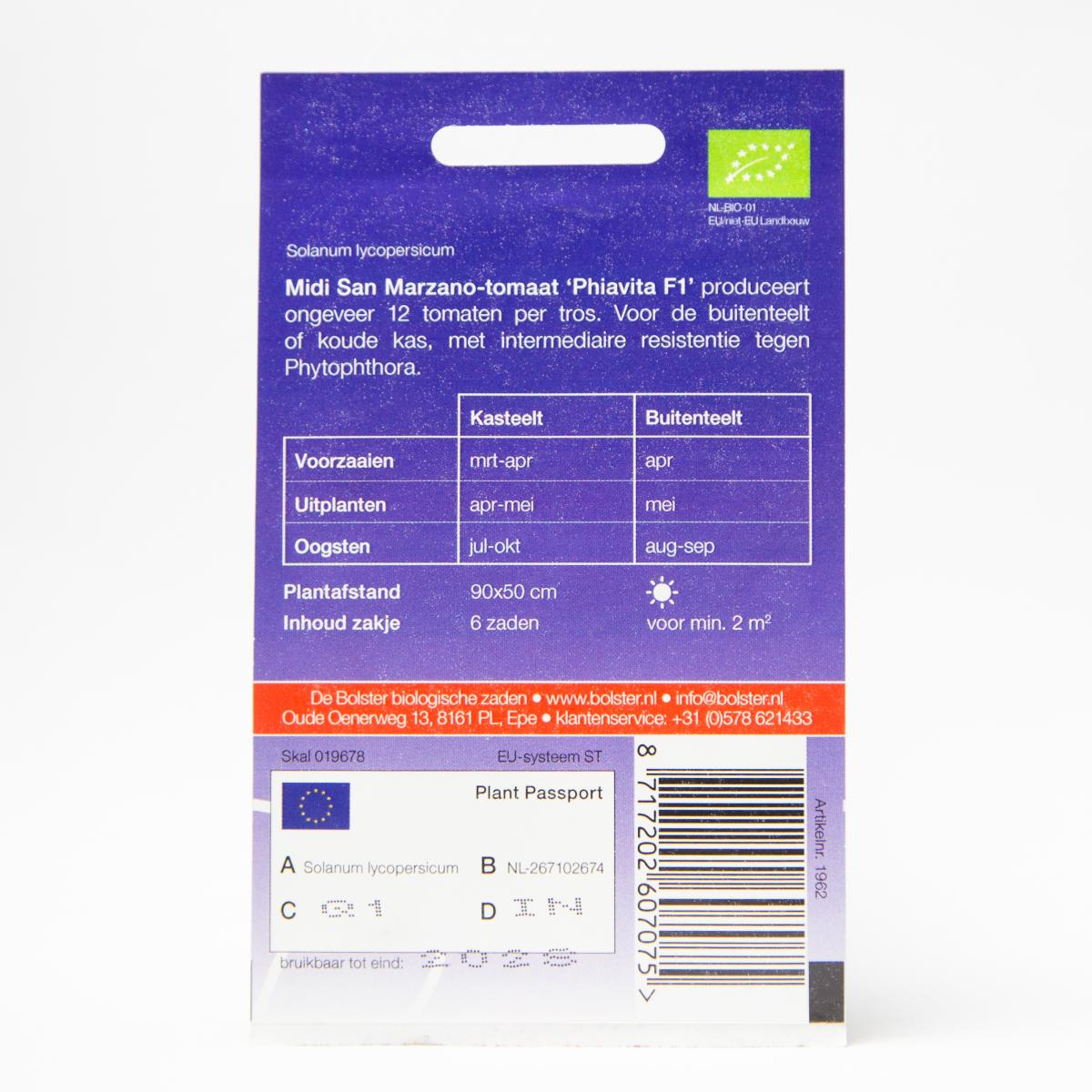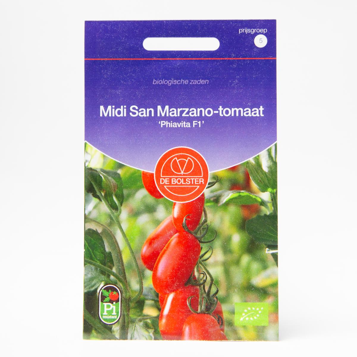 Midi San Marzano-tomaat 'Phiavita F1' (BOL-T-5505) produceert stevige, middelhoge planten met langwerpige tomaten. De plant is intermediair resistent tegen Phytophthora. Eén zakje is voor min. 2 m2, en de plantafstand bedraagt 90x50 cm.