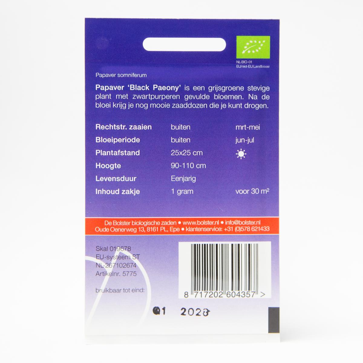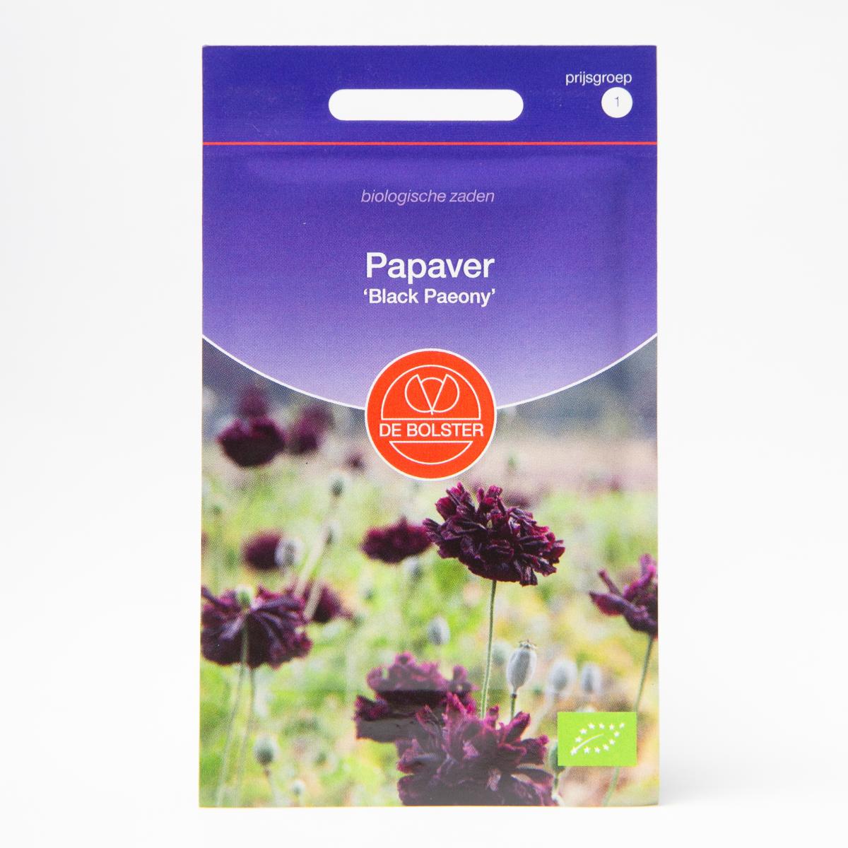 Na de bloei van papaver 'Black Paeony' krijg je mooie zaaddozen die je kunt drogen. Het is een grijsgroene stevige plant met zwartpurperen gevulde bloemen. Eén zakje is voor circa 30m2, en de plantafstand bedraagt 25x25cm.