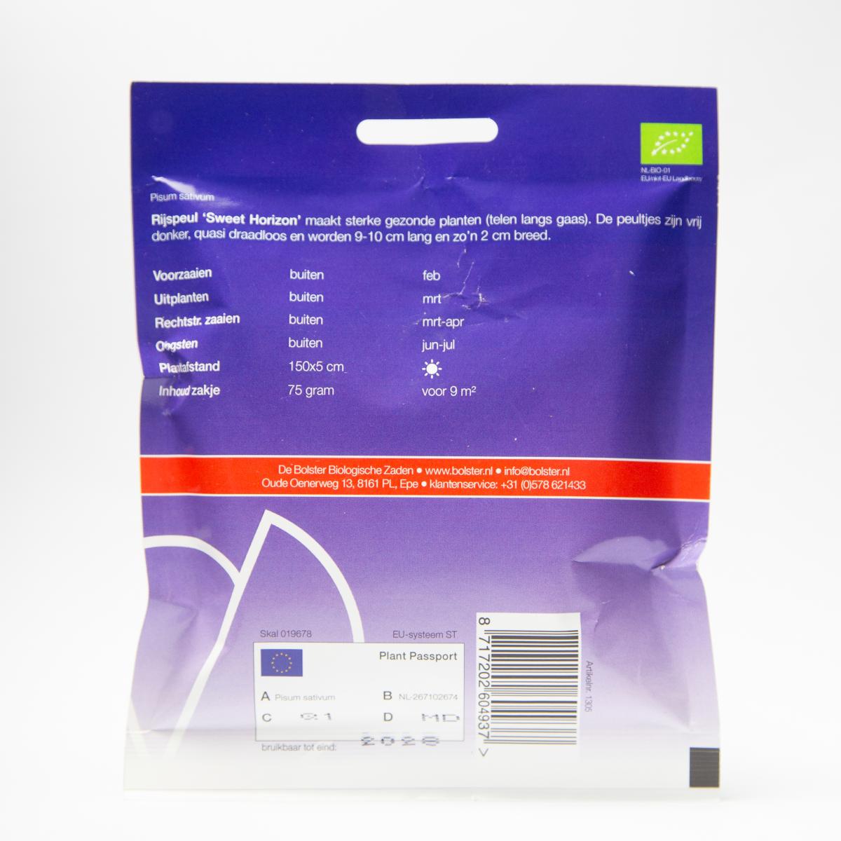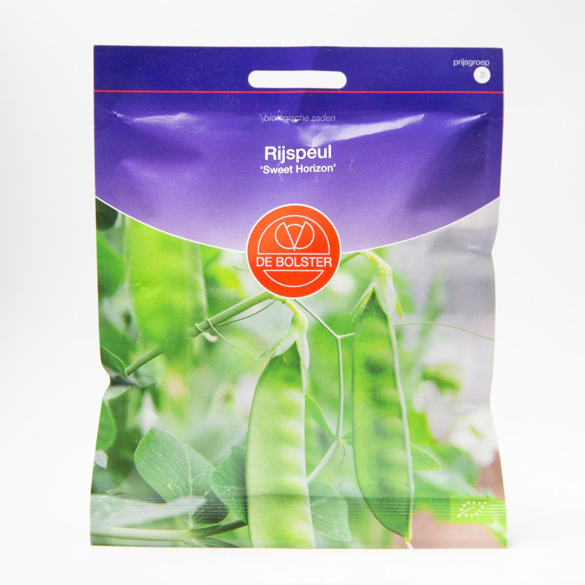 Rijspeul 'Sweet Horizon' maakt vrij donkere en schijnbaar draadloze peultjes die 9 à 10 cm lang worden en zo'n 2 cm breed. Dit ras maakt gezonde en sterke planten die langs gaas te telen zijn. Eén zakje is voor circa 9 m2, en de plantafstand bedraagt 150x5 cm.