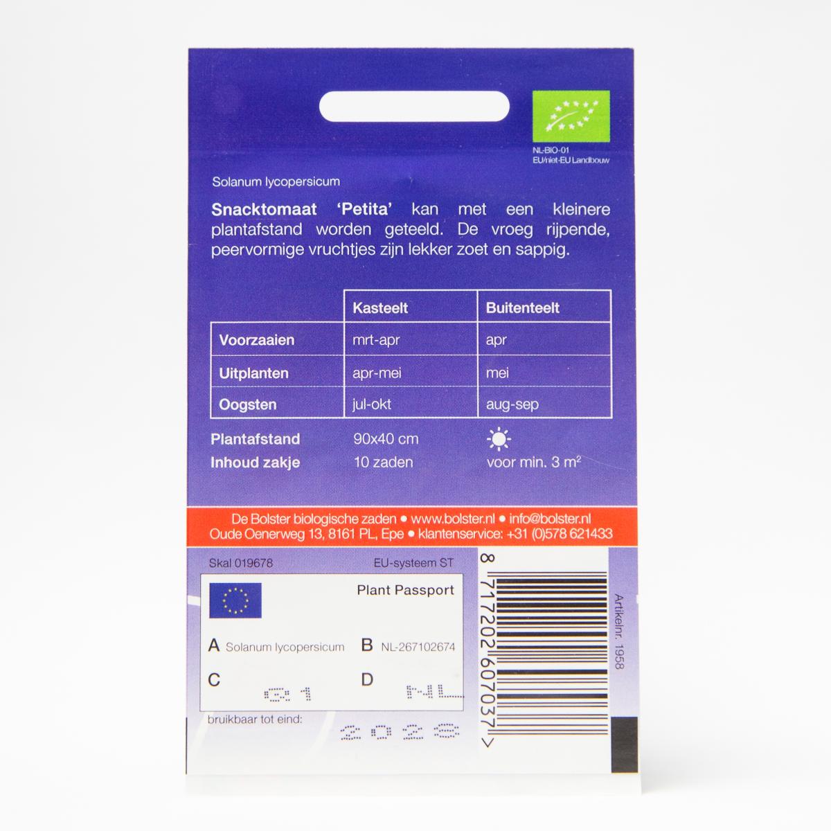De snacktomaat 'Petita' levert peervormige tomaatjes met een zoete, sappige smaak. De teelt heeft relatief weinig bemesting nodig. Vroeg rijpend en makkelijk te telen! Eén zakje is voor min. 3 m2, en de plantafstand bedraagt 90x40 cm.