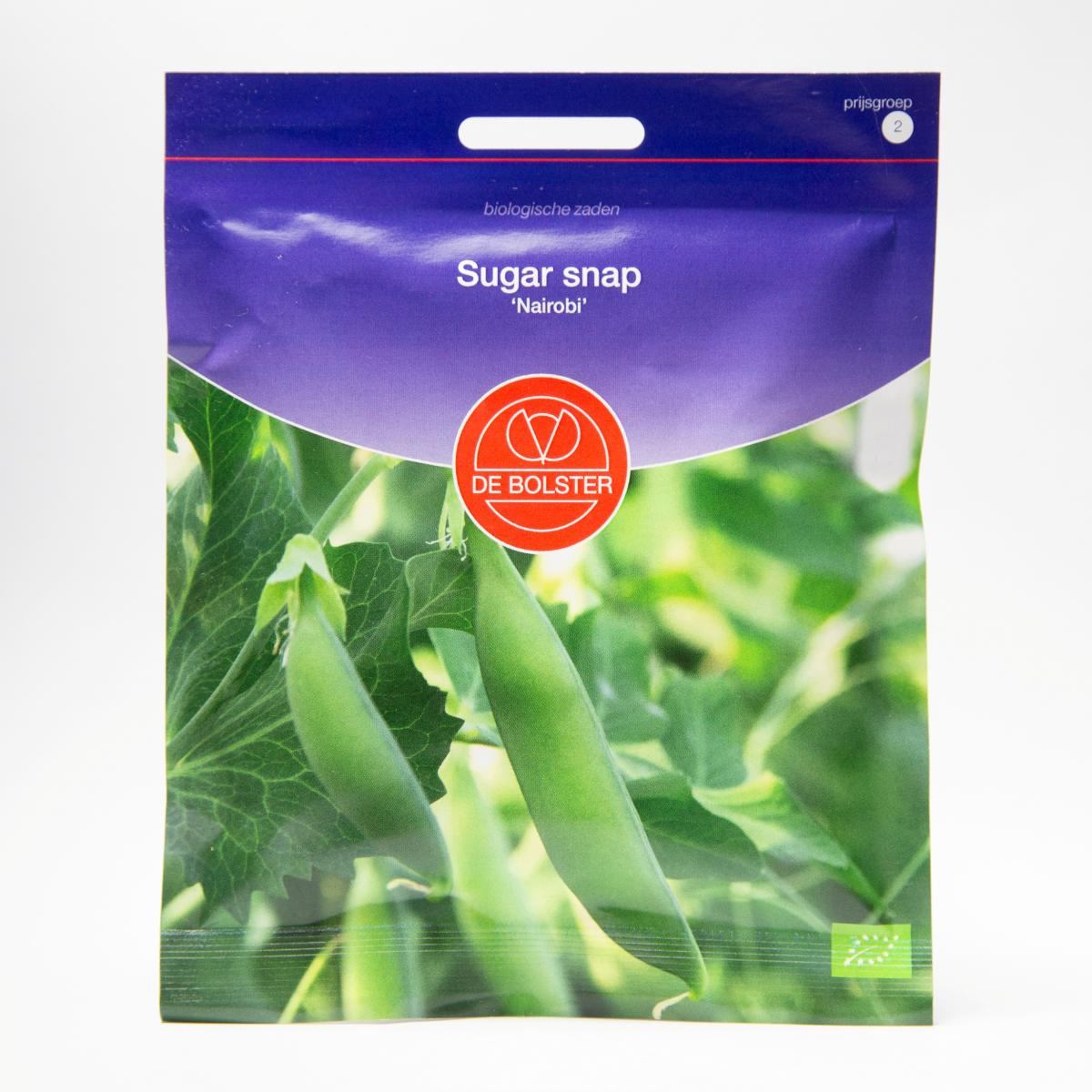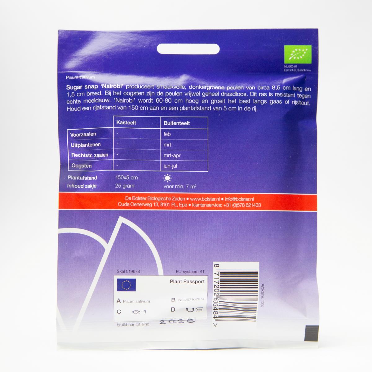 Sugar snap 'Nairobi' geeft donkergroene peulen, die in het plukstadium vrijwel draadloos zijn. De plant is resistent tegen meeldauw en de peulen worden ongeveer 8,5 cm lang. Een zakje is voor circa 7m2, en de plantafstand bedraagt 150x5 cm.